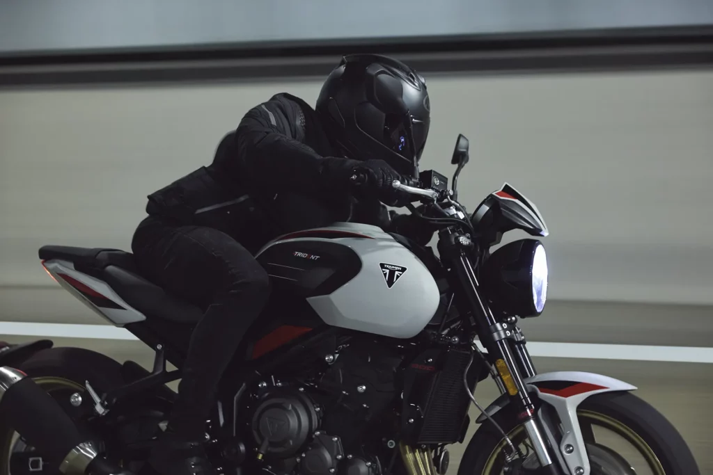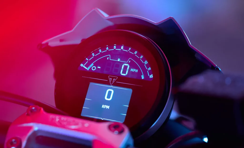 L’équipement comprend un tableau de bord combinant un écran TFT couleur de 3,5 pouces avec une partie LCD, la connectivité Bluetooth via l’application My Triumph, trois modes de conduite (Rain, Road, Sport), un régulateur de vitesse et un système complet d’aides électroniques à la conduite incluant ABS sur angle, contrôle de traction sensible à l’inclinaison et shifter.