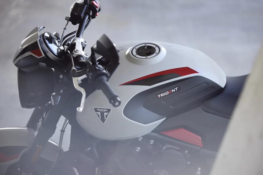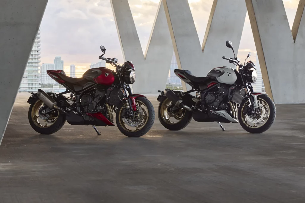 Le design hérite d’une ligne épurée, volontairement plus discrète que celle de la Street Triple, avec un phare rond à LED, un réservoir galbé et un silencieux compact respectant la norme Euro5+. Trois coloris sont proposés : Ash Grey avec détails Diablo Red, Carnival Red avec accents Graphite et Jet Black. Les roues dorées en aluminium moulé participent à son style fort et rétro sans extravagance toutefois. Comme à l’accoutumée pour Triumph, la montée en gamme est accompagnée d’un catalogue d’accessoires comprenant notamment un silencieux Akrapovic en titane et une large offre de pièces pour personnaliser la moto.